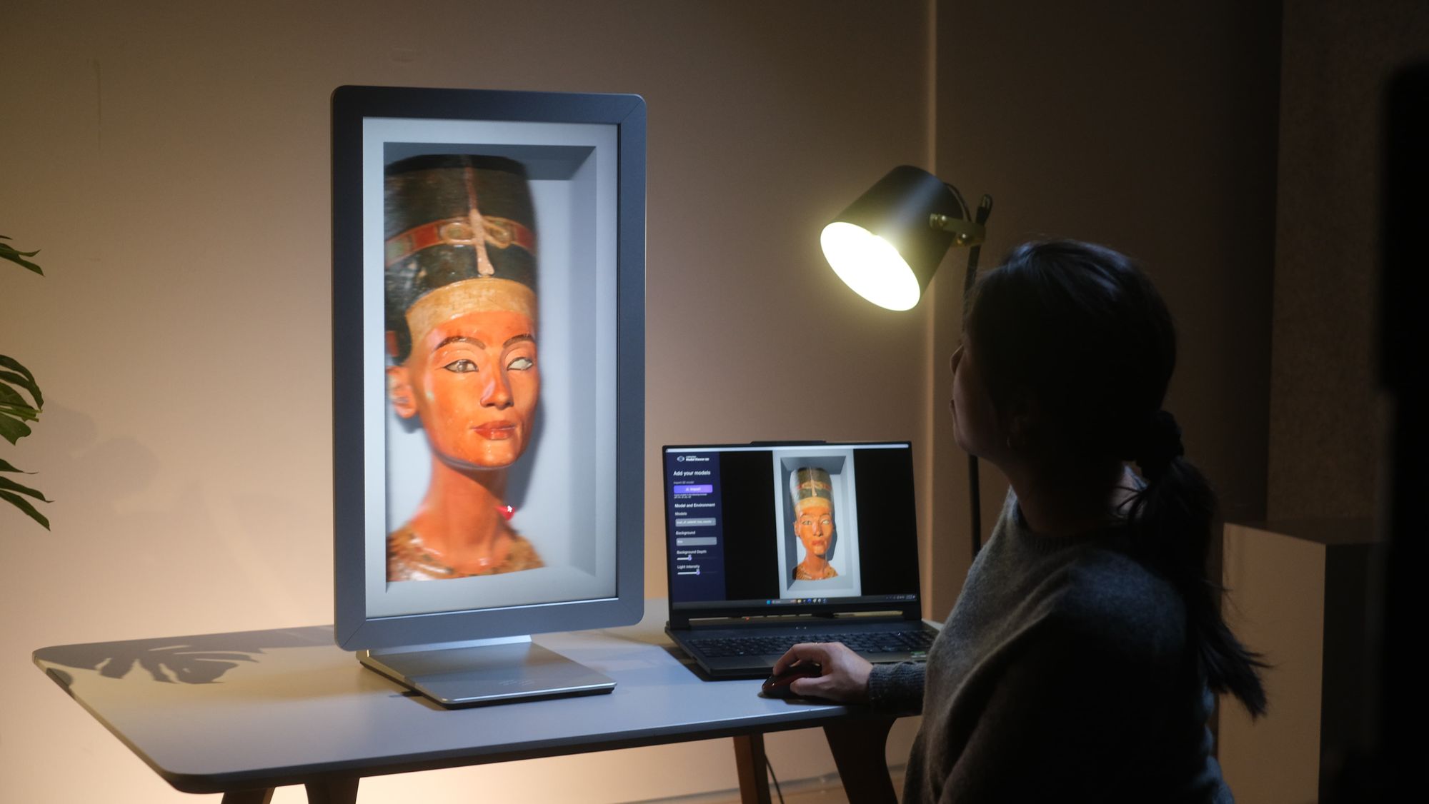 An iPad 11" (M4) on an iPad stand that can be directly attached to the base of a Looking Glass 27" Light Field Display to provide power, computation, and an interface